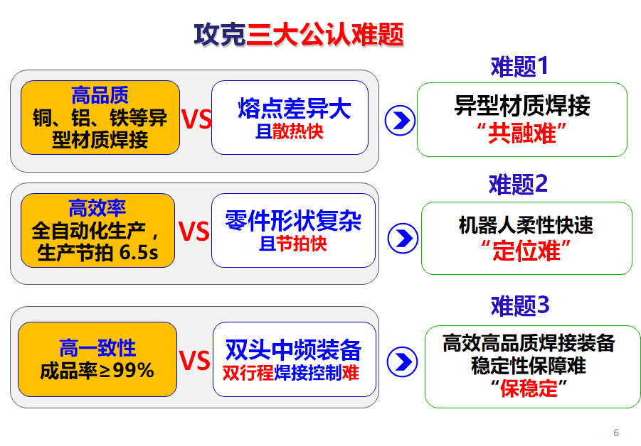 “異型材質(zhì)高效雙頭中頻焊接全自動(dòng)成套加工設(shè)備”項(xiàng)目攻克了三大行業(yè)公認(rèn)難點(diǎn):異型材質(zhì)焊接“共融難”、機(jī)器人柔性快速“定位難”和高效高品質(zhì)焊接裝備穩(wěn)定性保障難“保穩(wěn)定”。