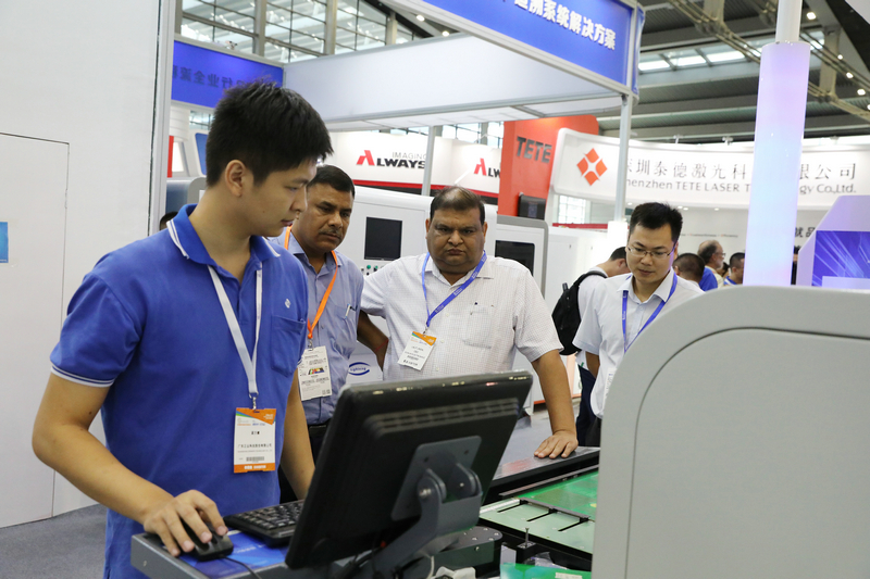 ▲技術(shù)人員為客戶(hù)講解PCB全自動(dòng)二維碼激光打標(biāo)機(jī)