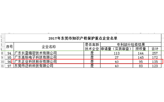 2017年6月,經(jīng)東莞市科學(xué)技術(shù)局審核篩選,廣東正業(yè)科技股份有限公司(股票代碼:300410)入選“2017年東莞市知識產(chǎn)權(quán)保護(hù)重點企業(yè)”。