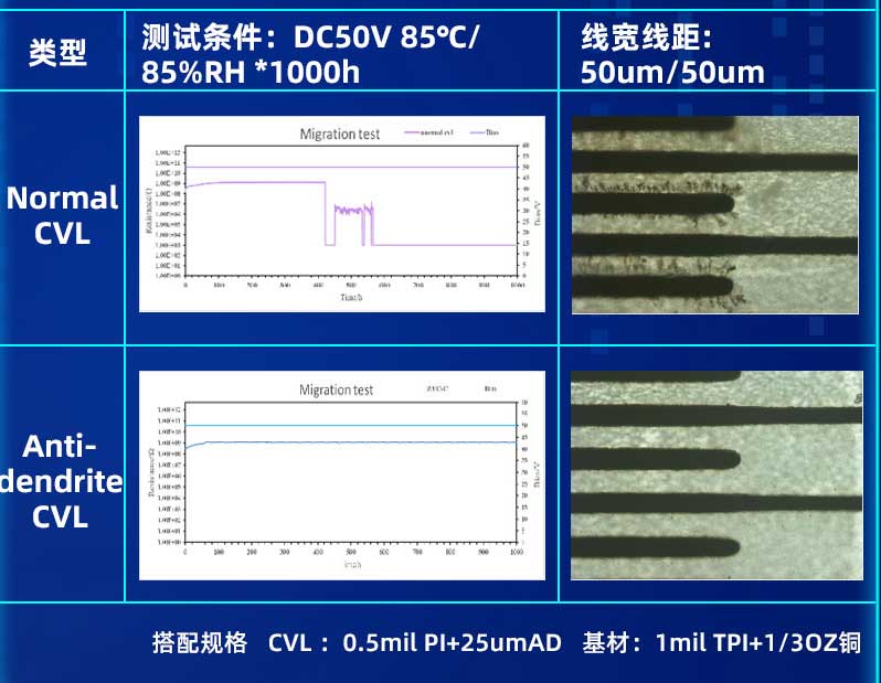 提高PCB基材的耐離子遷移性成為了電子產(chǎn)品開發(fā)中的迫切需求。因此,對于精細線路制程工藝,與之匹配的抗枝晶(Anti-dendrite)材料就顯得十分必要??怪Вˋnti-dendrite)材料的使用,能有效降低細線路間產(chǎn)生枝晶的風(fēng)險,提高FPC的可靠性。