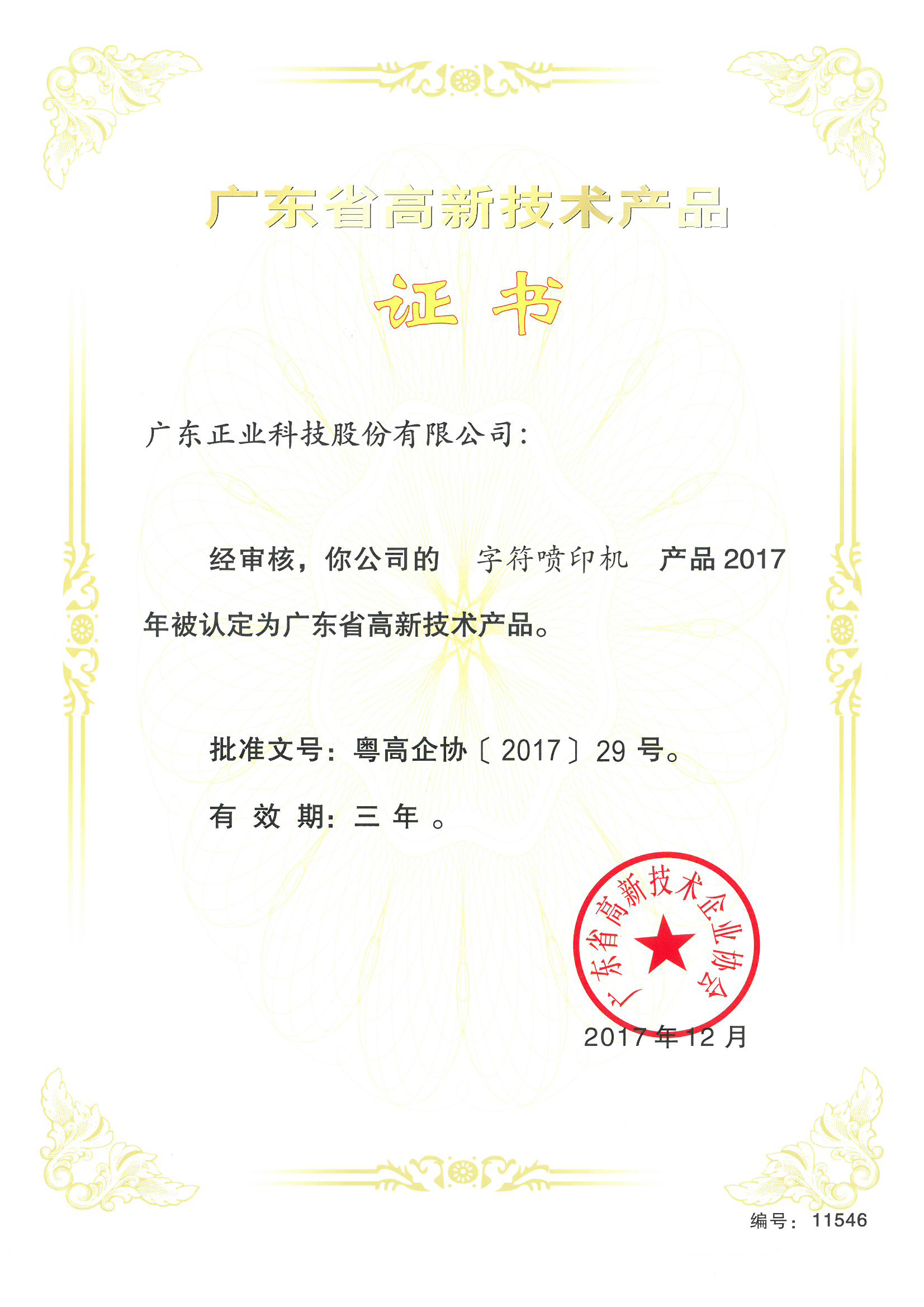 正業(yè)科技字符噴印機榮獲廣東省高新技術產品認證